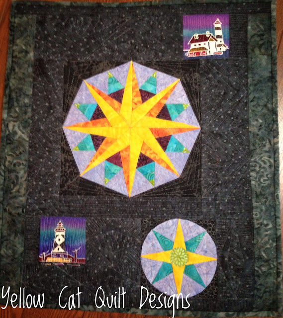 And here is my little quilt...all finished! My husband has long desired a Mariners Compass quilt, so here is one for him. The little light house blocks were purchased several years ago and I thought this would be a great place to use them. So glad I un-earthed them! They were made by Island Batik as well.